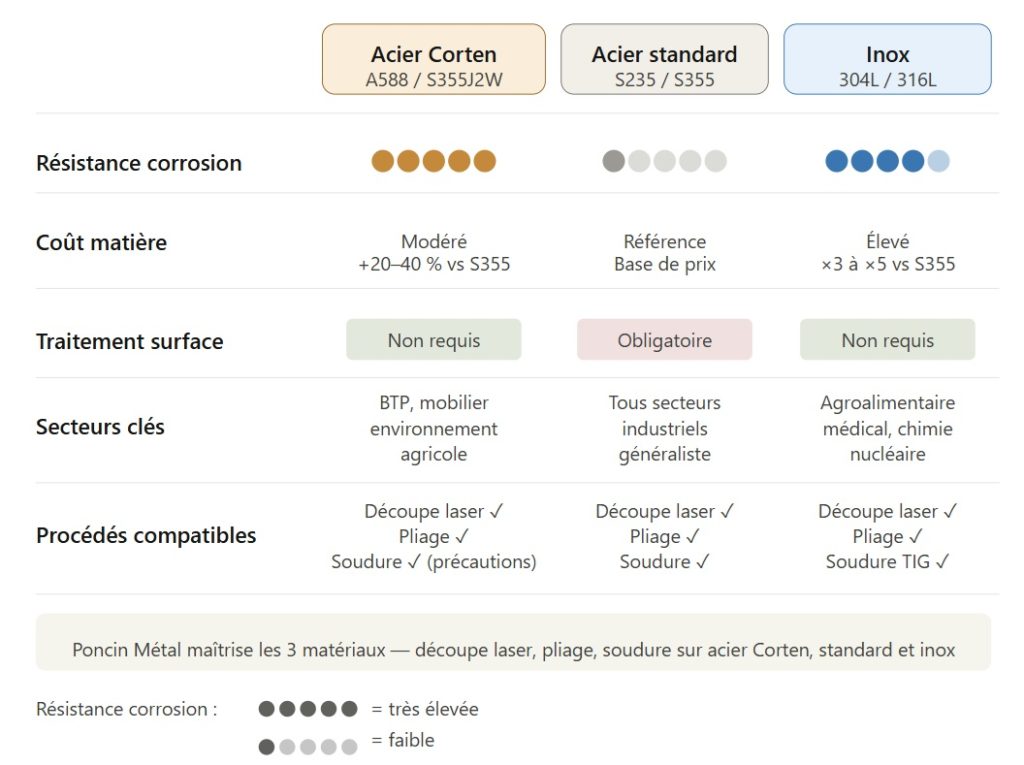 Le choix du matériau dépend du contexte d’utilisation et des contraintes de coût. L’acier Corten se positionne comme une alternative économique à l’inox pour les applications extérieures où l’absence d’entretien est un critère clé. Il coûte 20 à 40 % de plus qu’un [acier S235](lien article S235) standard, mais élimine les coûts de traitement de surface récurrents sur la durée de vie de la pièce.
