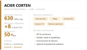 Condition importante : l’acier Corten ne doit pas être utilisé en milieu constamment immergé ou en atmosphère marine, où la patine ne se forme pas correctement. Dans ces cas, un traitement de surface reste nécessaire.