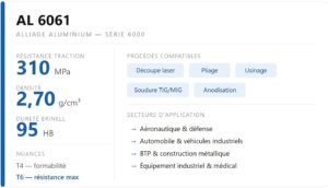 L’aluminium 6061 est l’un des alliages d’aluminium les plus répandus dans l’industrie. Sa composition à base de magnésium et silicium lui confère un excellent équilibre entre résistance mécanique, légèreté et usinabilité. Soudable, anodisable et compatible avec la découpe laser, il s’impose dans des secteurs aussi variés que l’aéronautique, l’automobile, le BTP et l’équipement industriel. C’est l’alliage de référence lorsqu’on cherche une alternative légère à l’acier sans sacrifier la tenue mécanique.